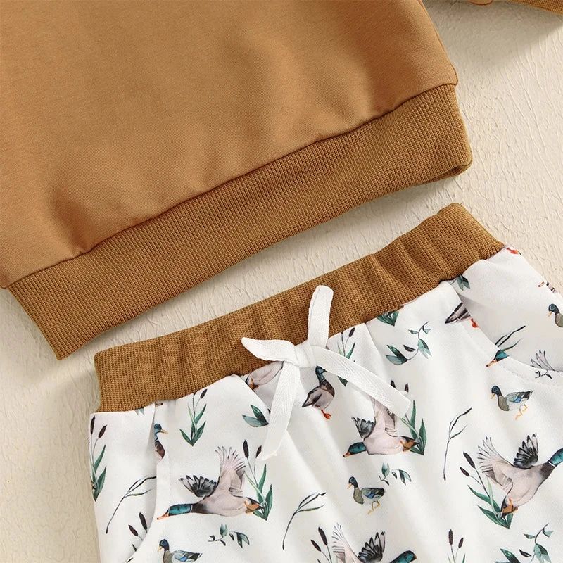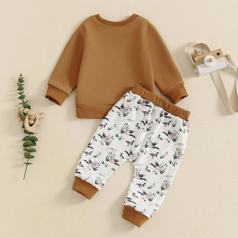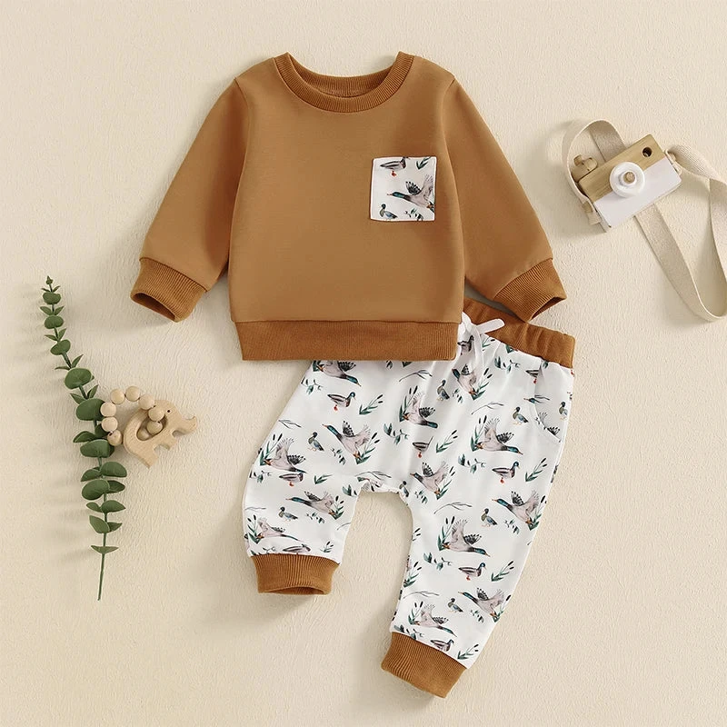 Complete 2-piece set – Includes matching pocket sweater and duck print pants for effortless coordination.