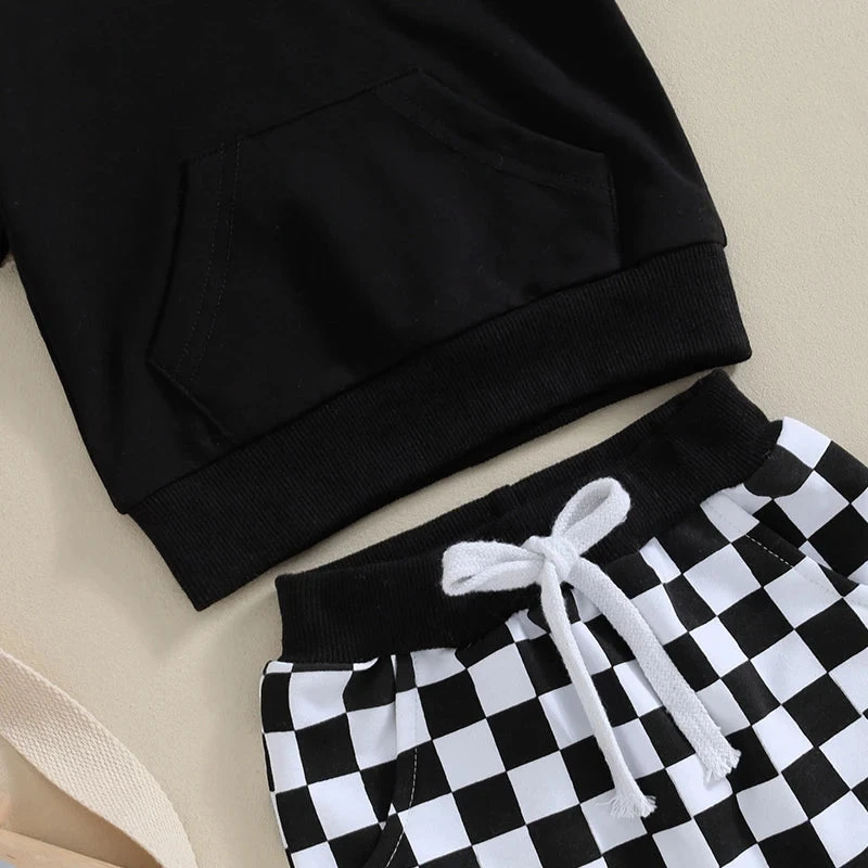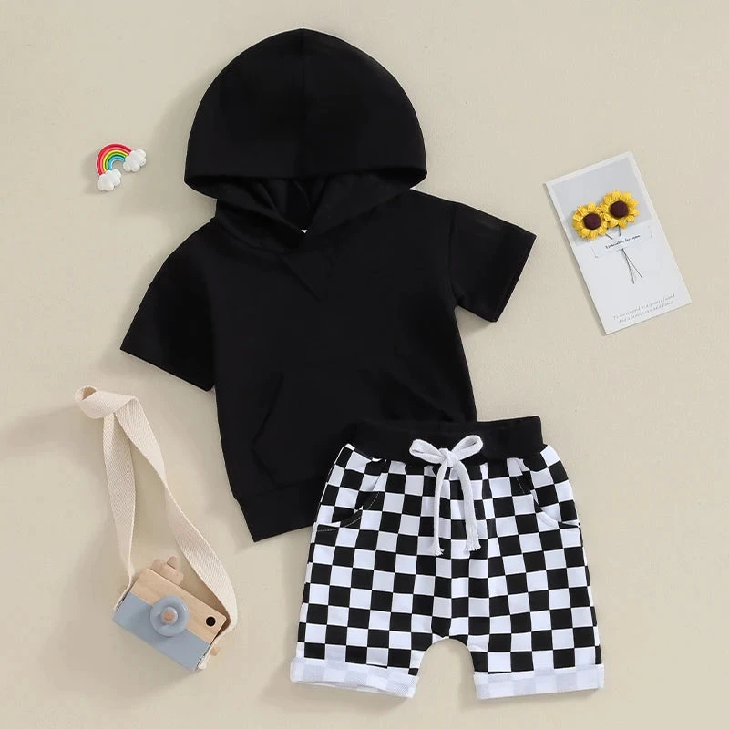 This is a 2-piece outfit set for baby and toddler boys featuring a short-sleeve solid hooded T-shirt paired with classic checkered shorts. Made from a soft cotton blend, it’s the perfect casual ensemble for warm weather days. The hooded tee adds a sporty touch, while the coordinated shorts complete the look. It solves the challenge of finding a put-together outfit that’s both comfortable enough for active play and stylish enough for everyday adventures.