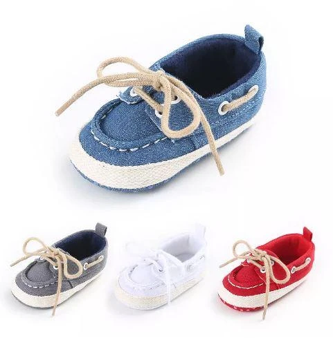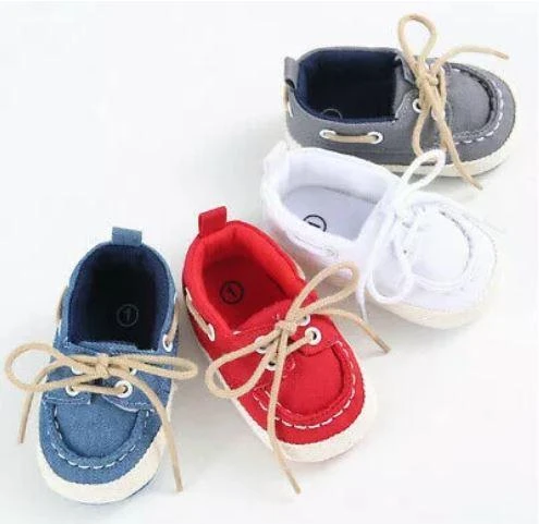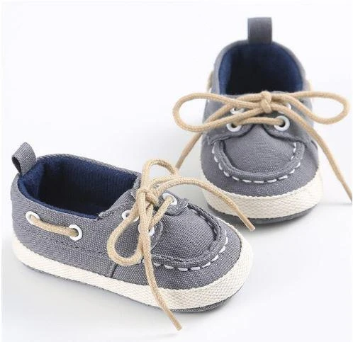 These are soft sole lace-up boat shoes for newborn and toddler boys and girls who need comfortable, flexible footwear for early steps and everyday play. Made with a canvas upper and cotton outsole, they feature a classic boat shoe design with lace-up closure for a secure fit. The soft sole allows natural foot movement while providing gentle protection. They solve the challenge of finding unisex shoes that are both stylish enough for any outfit and flexible enough for developing feet.