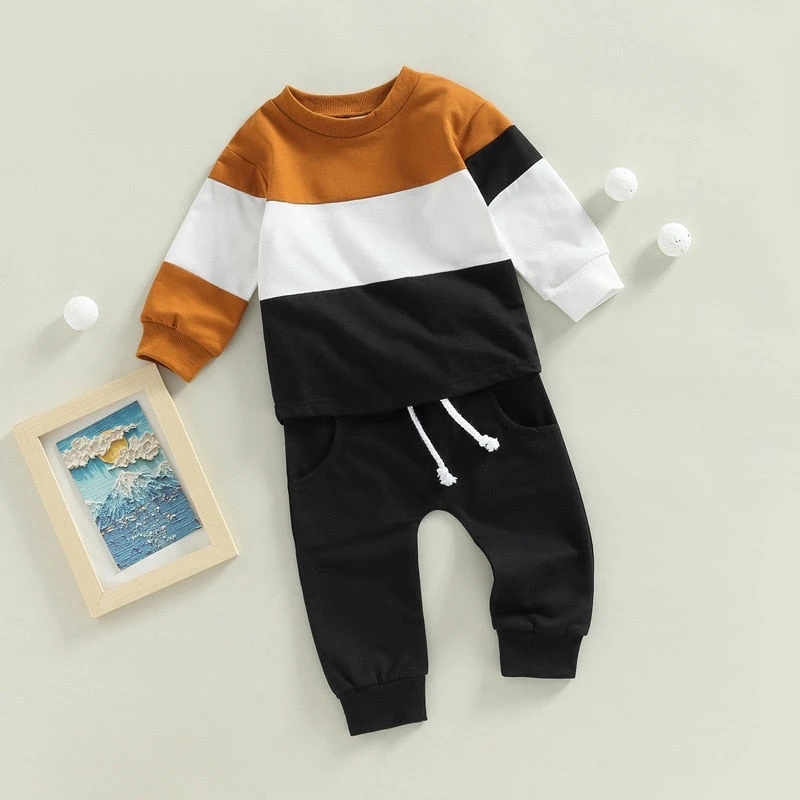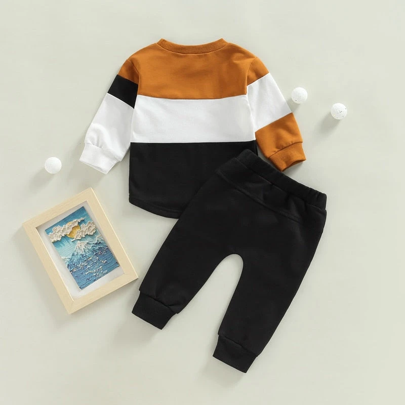 This is a 2-piece outfit set for baby and toddler boys featuring a colorful patchwork sweater top paired with matching pants. Made from a soft cotton blend, the long-sleeve sweater showcases a fun patchwork of solid colors, while the coordinating pants complete the look. Perfect for cooler weather, it solves the challenge of finding a coordinated outfit that’s both playful enough for everyday adventures and comfortable enough for all-day wear.