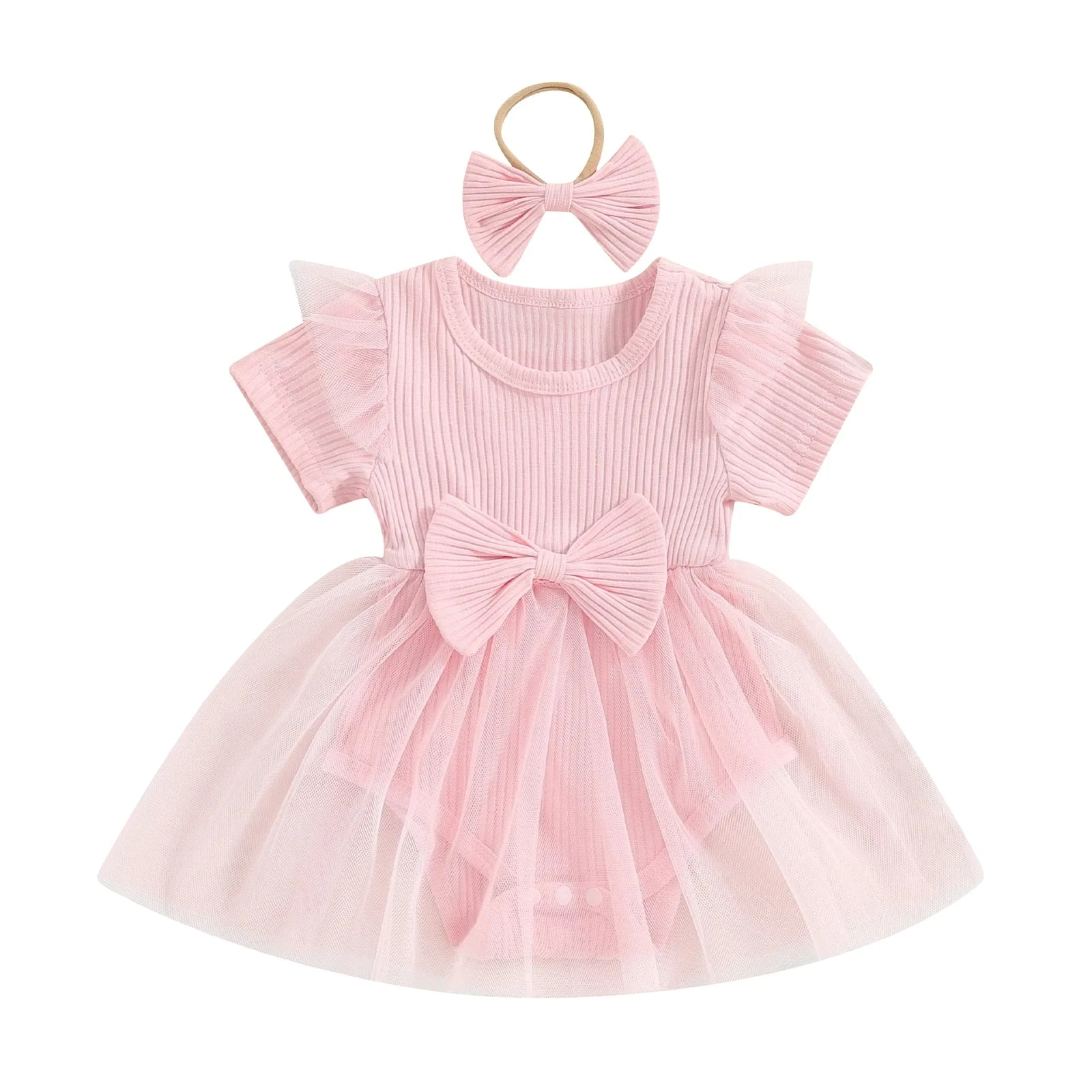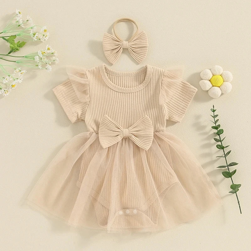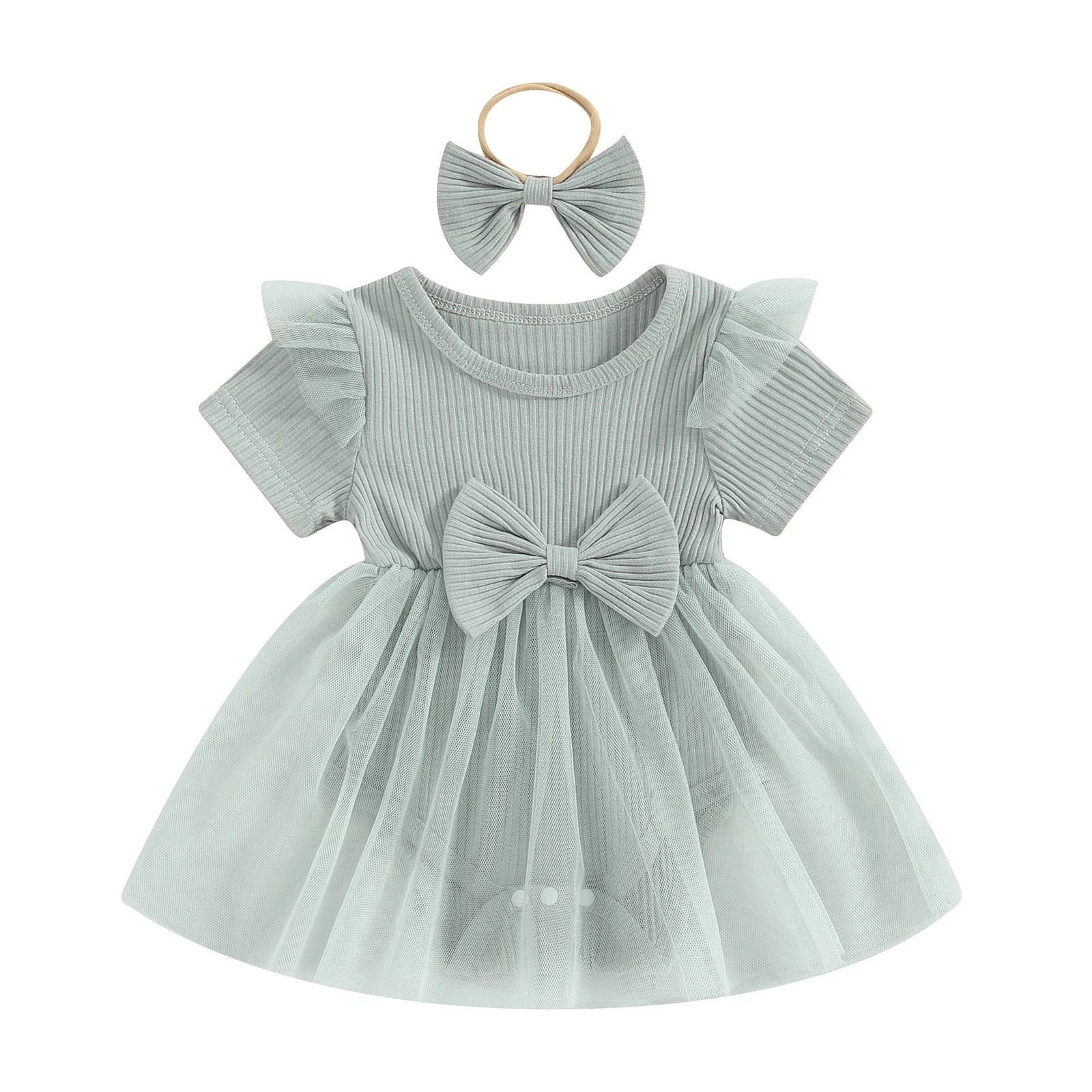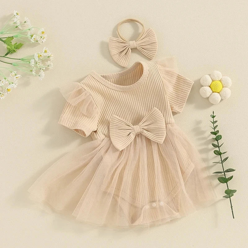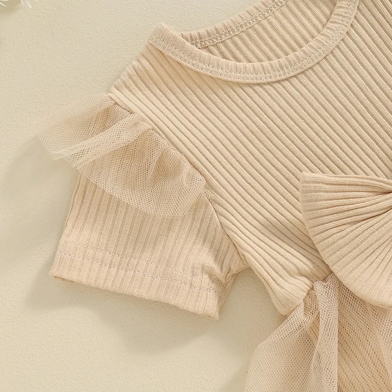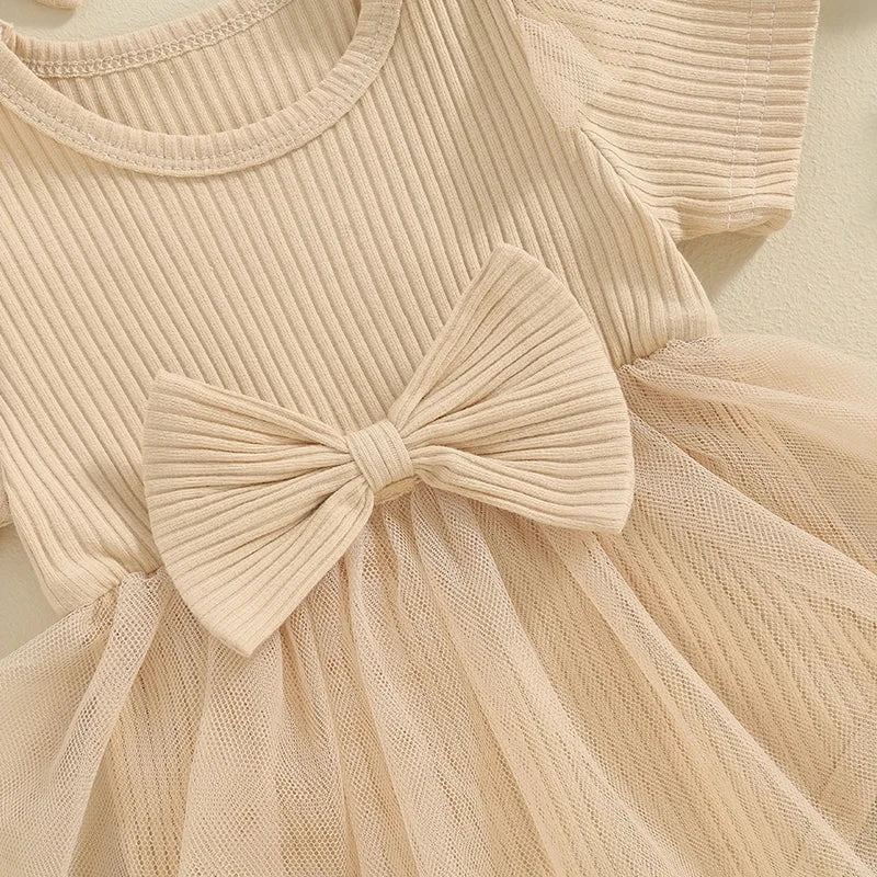 This is a 2-piece set for baby and toddler girls featuring a short sleeve ribbed bow dress with a matching headband. Made from a soft cotton blend, it combines classic solid colors with a sweet bow accent and comfortable ribbed texture. The coordinating headband completes the look, making it perfect for any occasion. It solves the challenge of finding a versatile, coordinated outfit that’s both simple enough for everyday wear and cute enough for special moments.