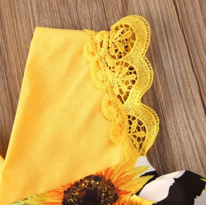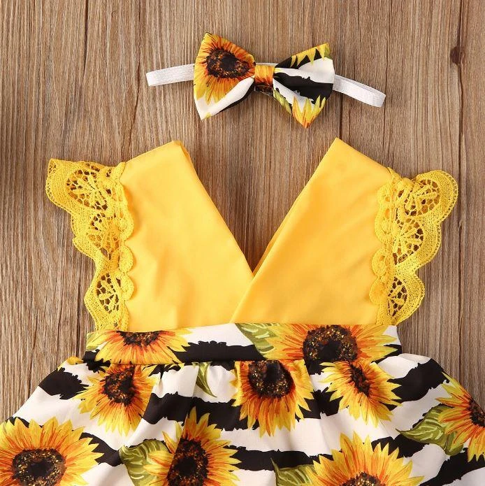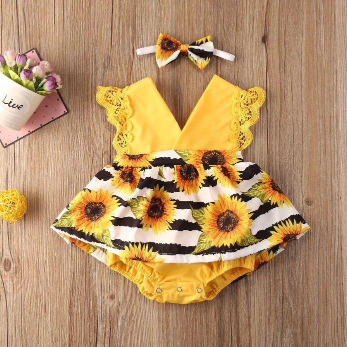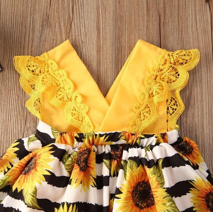 Style: Yellow sunflower striped romper dress with matching headband