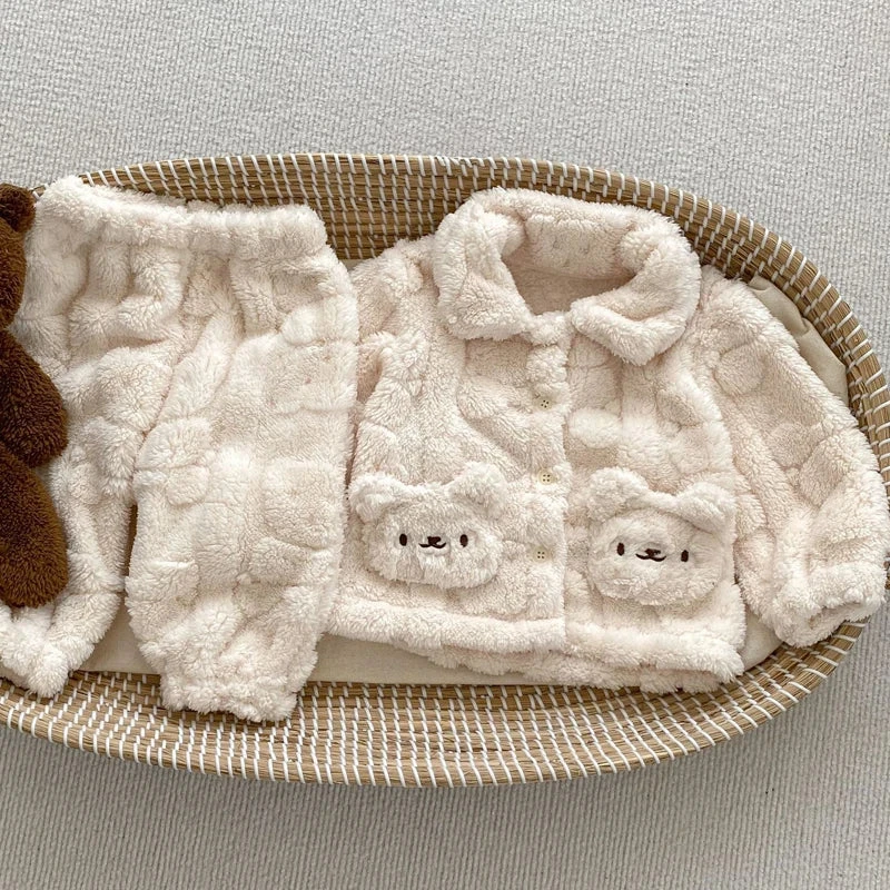 Style: Long-sleeve plush winter bear print button-up top with matching pants (2-piece set)